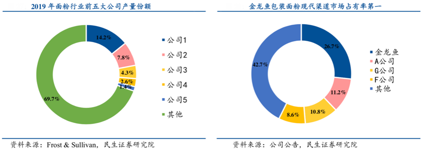 經(jīng)典案例:根據(jù) Frost & Sullivan、民生證券研究院等綜合資訊表明,2019 年面粉制造行業(yè)的產(chǎn)能 CR5 為30.3%,仍具備提升空間。根據(jù)公司公告、民生證券研究院等綜合資訊表明,按銷售量統(tǒng)計,金龍魚在包裝面粉現(xiàn)代渠道占據(jù)領(lǐng)先地位,2019 年市場占有率達 26.7%,排名第一。
