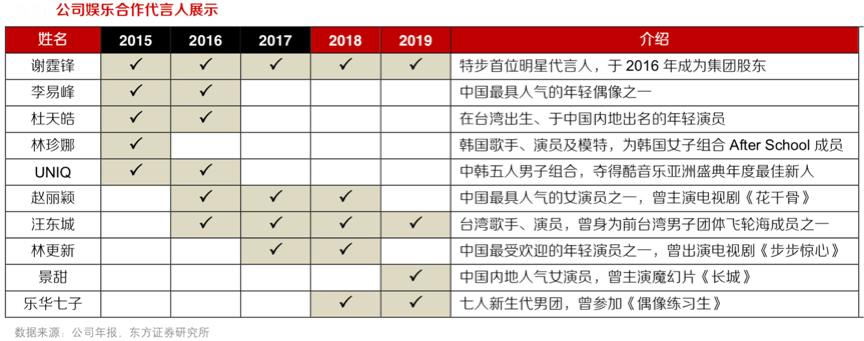 經(jīng)典案例:特步持續(xù)推進“娛樂營銷”,創(chuàng)新選擇娛樂合作代言人,與市場熱點緊密結(jié)合,從《花千骨》的熱度借勢,到2018年樂華七子《偶像練習(xí)生》聚集人氣突出品牌的年輕時尚氣息,引領(lǐng)國內(nèi)時尚營銷的風(fēng)尚。