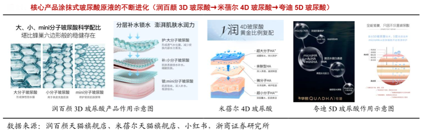 經(jīng)典案例:華熙生物的核心產(chǎn)品——“玻尿酸次拋原液”產(chǎn)品正持續(xù)迭代,以 2018 年推出的高端品牌夸迪的5D玻尿酸為例,其產(chǎn)品包含 Hyacross、Hymagic-5D、microHA、miniHA、AcHA 五大玻尿酸分子,能夠分別作用于皮膚角質(zhì)層、透明層、有棘層、顆粒層、基底層, 起到深層補水、強(qiáng)力鎖水作用。