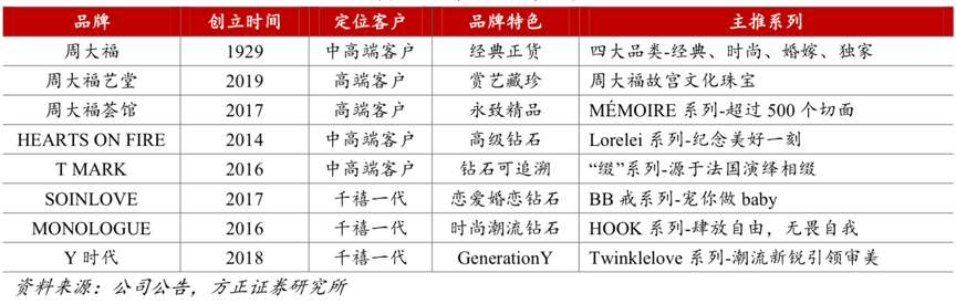 經(jīng)典案例:根據(jù)公司公告、方正證券研究所等綜合資訊表明,周大福近年來積極推進(jìn)多品牌發(fā)展策略,周大福主品牌與周大福藝堂,周大福薈館和 周大福鐘表等關(guān)聯(lián)品牌,以及HEARTS ON FIRE(HOF)、T MARK、SOINLOVE 與 MONOLOGUE 等其他品牌組成集團(tuán)“多品牌”發(fā)展策略,覆蓋了中高端多類客戶,品牌特色多樣,主推系列鮮明。