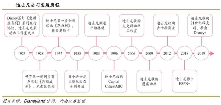 經(jīng)典案例:根據(jù)Disneyland官網(wǎng)、西南證券整理等綜合資訊表明,迪斯尼公司經(jīng)營多年發(fā)展,其擁有強(qiáng)大的“品牌IP經(jīng)營模式”。 2009 年收購漫威,2012 年收購盧卡斯, 2019 年收購 21 世紀(jì)??怂?,手握 Hotstar、HULU 控制權(quán),Disney+和 ESPN+所有權(quán),通過獨特生態(tài)閉環(huán)搭建流媒體平臺,利用優(yōu)質(zhì)的品牌IP進(jìn)軍流媒體市場。