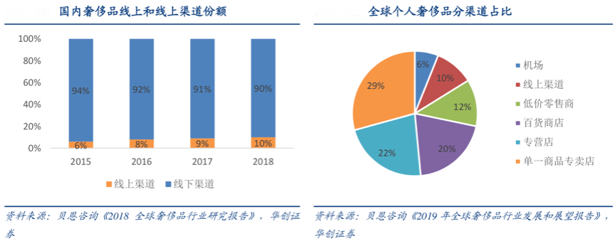 經(jīng)典案例:根據(jù)貝恩咨詢、華創(chuàng)證券等綜合資訊表明,2018 年中國奢侈品消費(fèi)線上渠道占比為 10%, 但線上渠道銷售份額在逐步提升。由于奢侈品單價(jià)較高、線下門店可為消費(fèi)者提供更強(qiáng)的產(chǎn)品質(zhì)量保證,同時(shí),各大品牌商也更加傾向于通過高端有風(fēng)格的線下門店保證其為顧客提供更舒適的購物體驗(yàn),線下渠道銷售是奢侈品品牌最重要的銷售渠道模式。