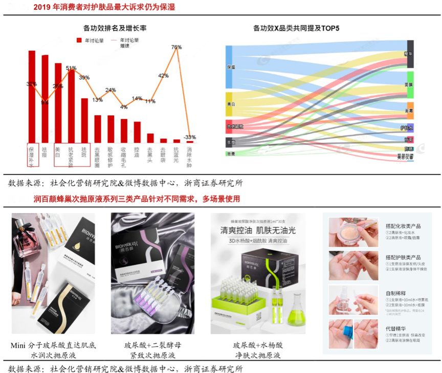 經(jīng)典案例:華熙生物在2014年正式推出潤百顏品牌C端護(hù)膚品,考慮到除保濕外消費者的其他細(xì)分護(hù)膚需求,公司通過在透明質(zhì)酸基礎(chǔ)上添加二裂酵母、水楊酸、煙酰胺等方式達(dá)到抗老、祛痘、美白等效果,從而開發(fā)出增強彈力、緊致滋養(yǎng)、清爽控油等多種次拋型玻尿酸產(chǎn)品。