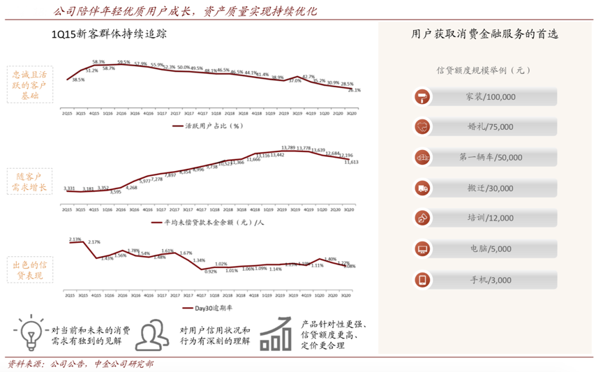 經(jīng)典案例:根據(jù)公司公告、中金公司研究部等綜合資訊表明,樂信公司 2015 年的用戶群體, 隨著收入的增長(zhǎng)及消費(fèi)需求的變化,其自身獲得的借款額度也會(huì)慢慢提升,人均借款金 額從 2Q15 的 3,331 元增長(zhǎng)至 3Q20 的11,613 元,同時(shí)這部分用戶群體的資產(chǎn)質(zhì)量也在持續(xù)改善,30 天逾期率從 2Q15 的 2.13%降至 3Q20 的 1.08%。