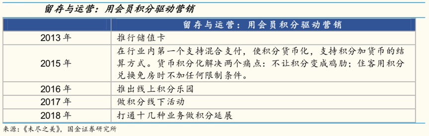 經典案例:根據《未盡之美》、國金證券研究所等綜合資訊表明,華住通過積分驅動營銷,線上積分線下活動等,加強與會員的互動,增加會員留存。例如,2015 年在行業(yè)內第一個支持混合支付,支持積分加貨幣的結算方式,同時在住客使用積分兌換免費房時不加任何限制,解決一直以來會員積分實際兌換價值低,對會員而言體驗感差的痛點。