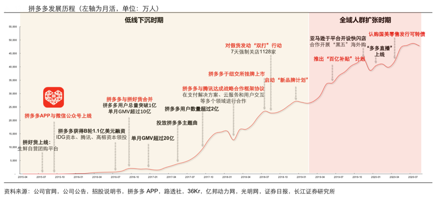 經(jīng)典案例:根據(jù)公司官網(wǎng)、公司公告、招股說明書、拼多多APP、路透社、36Kr、億邦動(dòng)力網(wǎng)、光明網(wǎng)、證券日?qǐng)?bào)和長江證券研究所等綜合資訊表明,拼多多用戶開拓的發(fā)展歷程可以分為兩個(gè)階段:第一個(gè)階段是在微信導(dǎo)流管控寬松期結(jié) 束前迅速通過社交裂變方式進(jìn)入下沉市場,并留存了大量粘性客群;第二個(gè)階段是通過 百億補(bǔ)貼向高線市場滲透,從而對(duì)全域人群的擴(kuò)張。