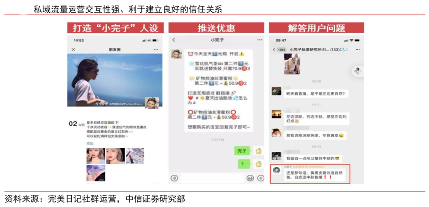 經(jīng)典案例:根據(jù)完美日記社群運(yùn)營(yíng)、中信證券研究部等綜合資訊表明,完美日記通過打造導(dǎo)購(gòu)“小完子”的精致少女人設(shè),不定期向用戶推送商品優(yōu)惠、解答用戶問題,有效拉近了與用戶的距離。同時(shí)品牌能夠通過微信群、個(gè)人微信等載體,實(shí)現(xiàn)與用戶的雙向溝通,通過發(fā)布用戶調(diào)研等方式洞察消費(fèi)者的真實(shí)需求。