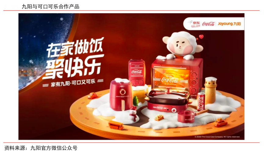 經(jīng)典案例:根據(jù)九陽官方微信公眾號(hào)、中信證券研究部等綜合資訊表明,九陽積極學(xué)習(xí)小熊、摩飛等年輕化戰(zhàn)略,捕捉當(dāng)代年輕人的興趣愛好與生活習(xí)慣。 截止 2021 年 1 月,其累計(jì)已經(jīng)與 Line Friends、Hello Kitty、皮卡丘、喜茶、哆啦 A 夢(mèng)和可口可樂等實(shí)現(xiàn)合作,積極推出各類聯(lián)名產(chǎn)品,吸引年輕消費(fèi)群體。在產(chǎn)品功能上,其通過覆蓋養(yǎng)生、便攜和一人食等多維度需求,推出了養(yǎng)生壺、果汁杯、鍋灶分離火鍋、小型烤箱等長尾產(chǎn)品。