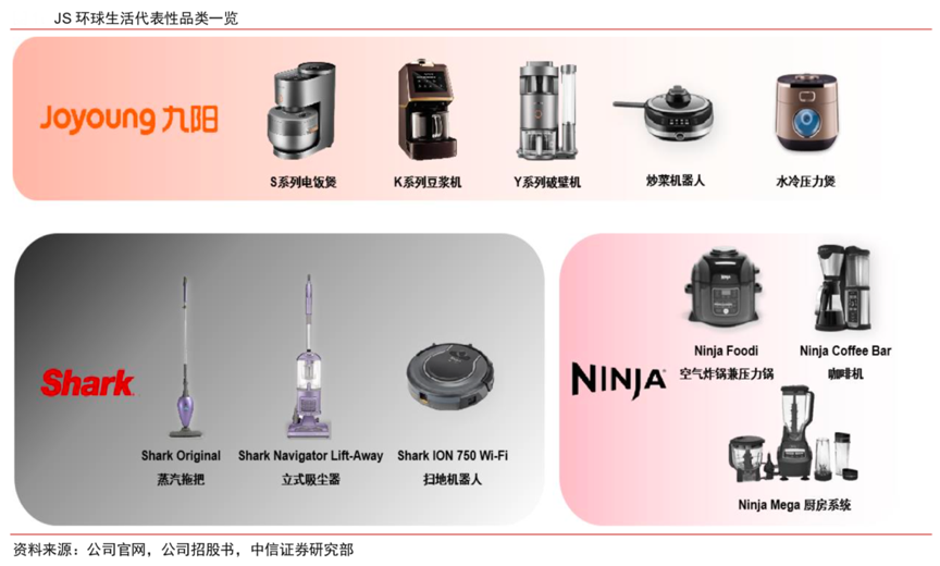 經(jīng)典案例:根據(jù)公司官網(wǎng)、公司招股說明書、中信證券研究部等綜合資訊表明,JS環(huán)球生活公司為全球第六大小家電企業(yè),其陸續(xù)推出了破壁機(jī)、蒸汽拖把和 Foodi 系 列等全新小家電品類,均收獲市場(chǎng)熱捧。截至2020H1,其旗下的九陽始終穩(wěn)坐中國小家電行業(yè)前三甲;Shark主攻清潔電器領(lǐng)域,其中美國市場(chǎng)吸塵機(jī)/掃地機(jī)器人分別位居第一/第二,市占率超越戴森;Ninja主攻廚房電器領(lǐng)域,其中美國市場(chǎng)多功能烹飪煲/破壁機(jī)等品類位居第一。
