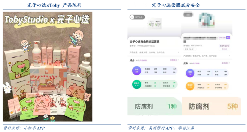 經(jīng)典案例:根據(jù)小紅書APP、美麗修行APP、華創(chuàng)證券等綜合資訊表明,完子心選主打溫和護(hù)膚品,以護(hù)膚品為抓手,價(jià)格控制在 50-150 元內(nèi)。完子心選與 Toby、 魔卡少女櫻聯(lián)名,因其精致可愛的產(chǎn)品包裝、顏色受到廣泛關(guān)注。在第三方 APP 測(cè)評(píng)中,以完子高山茶煥活面膜為例,不含香精與風(fēng)險(xiǎn)成分,僅含 1 種防腐劑,安全分 4.3 分。