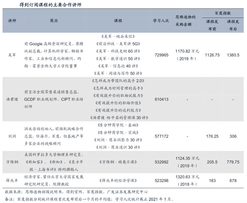 經(jīng)典案例:根據(jù)思維造物招股說(shuō)明書、得到官網(wǎng)、百度指數(shù)、廣發(fā)證券發(fā)展研究中心等綜合資訊表明,得到公司通過(guò)專業(yè)化的課程制作和品控流程,流程式打造了多IP的優(yōu)質(zhì)課程矩陣。截至2021年1月11日,得到上總學(xué)習(xí)人次超過(guò)50萬(wàn)的講師已有吳軍、湯君健、劉潤(rùn)、脫不花、萬(wàn)維鋼、薛兆豐、 戴愫、張遇升,這些商業(yè)領(lǐng)域?qū)<医柚玫狡脚_(tái)快速擴(kuò)大知名度和影響力。