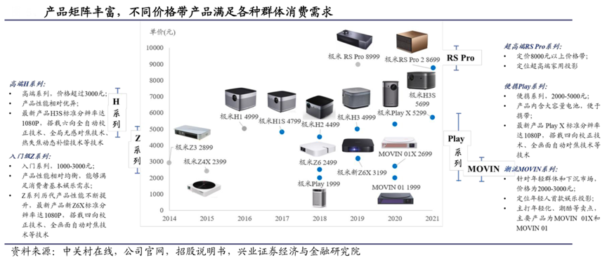 經(jīng)典案例:根據(jù)中關(guān)村在線、公司官網(wǎng)、招股說(shuō)明書(shū)、興業(yè)證券經(jīng)濟(jì)與金融研究院等綜合資訊表明,極米專(zhuān)注智能微投品類(lèi),分為五大系列: RS Pro 系列、H 系列、Z 系列、便攜 Play 系列和子品牌 MOVIN,分別對(duì)應(yīng)超高 端到入門(mén)級(jí)不同價(jià)格帶和消費(fèi)群體,其中入門(mén)級(jí) Z 系列和高端 H 系列貢獻(xiàn)為支柱, 2020 年收入占比分別為30%/40%。極米多款明星單品行業(yè)銷(xiāo)量領(lǐng)先,根據(jù)京東平臺(tái)數(shù)據(jù),2019 年極米共有 5 款產(chǎn)品位列國(guó)內(nèi)智投銷(xiāo)量Top10,其中極米 Z6、H2 登頂前兩名。