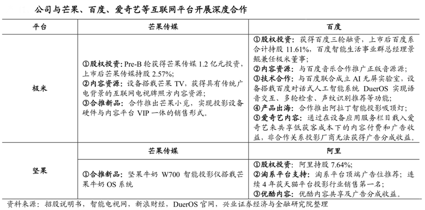 經(jīng)典案例:根據(jù)中關(guān)村在線、智能電視網(wǎng)、新浪財(cái)經(jīng)、DuerOs官網(wǎng)、興業(yè)證券經(jīng)濟(jì)與金融研究院等綜合資訊表明,極米公司背靠百度,以股權(quán)融資、內(nèi)容共享、技術(shù)合作以及產(chǎn)品出海等方式與百度系和芒果 TV 等內(nèi)容平臺(tái)展開(kāi)深度合作,收效明顯。極米設(shè)備搭載百度對(duì)話式人工智能 DuerOS 系統(tǒng)提高智能性,打造行業(yè)領(lǐng)先的智能語(yǔ)音遙控智投設(shè)備。
