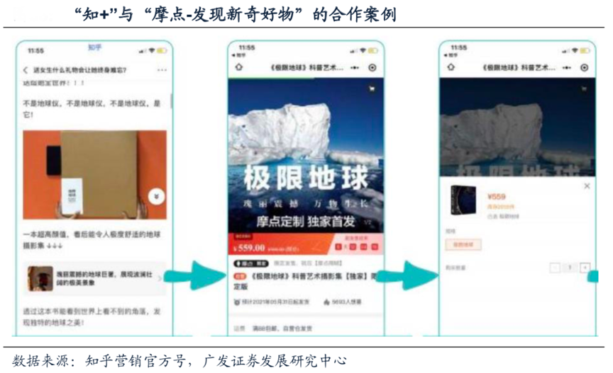 經(jīng)典案例:根據(jù)知乎營銷官方號、廣發(fā)證券發(fā)展研究中心等綜合資訊表明,結(jié)合知乎招股說明書,知乎公司內(nèi)容商業(yè)化解決方案的整體點(diǎn)擊率是傳統(tǒng)廣告的數(shù)倍。例如“知+”與“摩點(diǎn)-發(fā)現(xiàn)新奇好物”的合作案例,通過知+選題工具甄選與之相關(guān)且高度匹配的高關(guān)注度問題,對接個(gè)人創(chuàng)作者撰寫優(yōu)質(zhì)內(nèi)容并利用知+在目標(biāo)用戶場景精準(zhǔn)投放,截止2021.5.1,“摩點(diǎn)”平臺推薦的好物回答已經(jīng)收到了2662個(gè)贊。