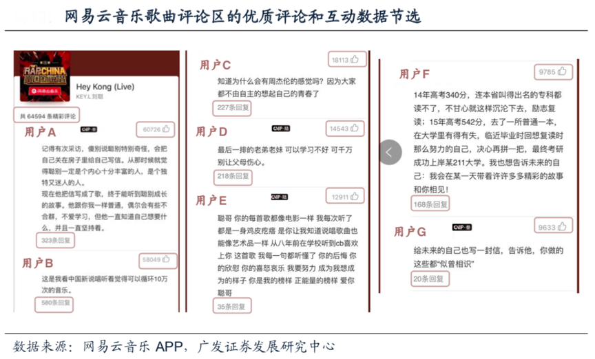 經典案例:根據網易云音樂APP、廣發(fā)證券發(fā)展研究中心等綜合資訊表明, 2021年2月,聽眾有48%瀏覽了評論區(qū),評論區(qū)成為用戶生產內容的入口之一,是網易云音樂在早期區(qū)別于其他音樂產品的差異化功能之一。評論區(qū)的內容數量和質量都保持較高水準,用戶基于評論產生了較強的互動。以劉聰的代表作《Hey Kong》的歌曲評論區(qū)為例,截止2021年6月1日,這首歌累計有 6萬+條用戶產生的評論,點贊數排名靠前的評論點贊量也超過了6萬,同時還有數百條用戶回復,高質量的評論區(qū)成為用戶和歌手的精神樂園。