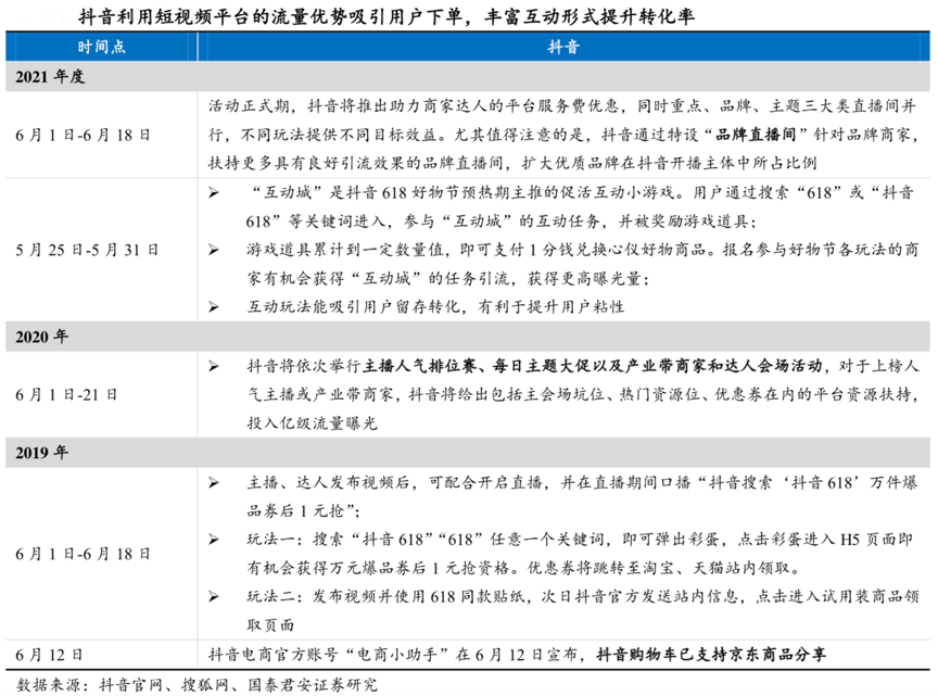 經(jīng)典案例:根據(jù)抖音官網(wǎng)、搜狐網(wǎng)、國(guó)泰君安證券研究等綜合資訊表明,抖音利用短視頻平臺(tái)的流量?jī)?yōu)勢(shì)吸引用戶下單,豐富互動(dòng)形式提升轉(zhuǎn)化率。