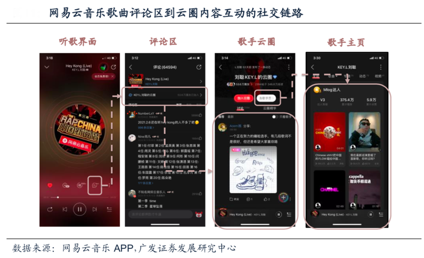 經(jīng)典案例:根據(jù)網(wǎng)易云音樂APP、廣發(fā)證券發(fā)展研究中心等綜合資訊表明,云村和云圈為音樂創(chuàng)作者和音樂愛好者提供了交流互動(dòng)空間和興趣小組,其從產(chǎn)品端打通了從用戶聽歌、評(píng)論互動(dòng),再轉(zhuǎn)化到歌手云圈、云村的一整條內(nèi)容創(chuàng)作到用戶反饋和關(guān)系沉淀的鏈路。