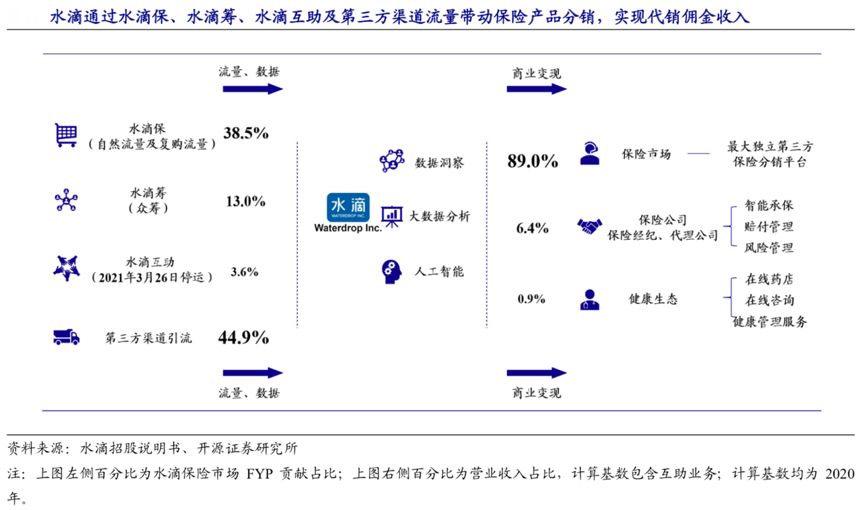 經(jīng)典案例:根據(jù)水滴招股說(shuō)明書(shū)、開(kāi)源證券研究所等綜合資訊表明,截至2020 年末,水滴籌通過(guò)其特有裂變式擴(kuò)散模式已獲取 3.4 億人捐款,累計(jì)覆蓋 170 萬(wàn)病人,金額超 370 億元,水滴籌的快速擴(kuò)張為保險(xiǎn)分銷業(yè)務(wù)初期貢獻(xiàn)較多流量轉(zhuǎn)化,同時(shí)第三方渠道流量貢獻(xiàn) FYP,則自 2018 年的 1.9%提升至 2020 年的 44.9%。
