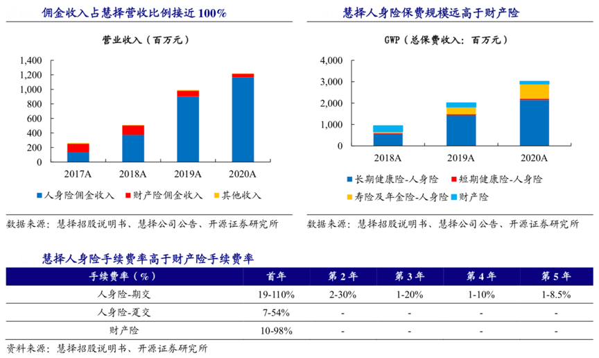 經(jīng)典案例:根據(jù)慧擇公司公告、慧擇招股說(shuō)明書(shū)、開(kāi)源證券研究所等綜合資訊表明,慧擇專注保險(xiǎn)經(jīng)紀(jì)業(yè)務(wù),營(yíng)業(yè)收入主要來(lái)自于經(jīng)紀(jì)業(yè)務(wù)傭金收入,占比營(yíng)業(yè)收入自 2017 年 95.5%提升至 2020 年 99.6%,另有較小部分其他收入來(lái)自于保險(xiǎn)售前咨詢。經(jīng)紀(jì)業(yè)務(wù)中,人身險(xiǎn)帶來(lái)傭金收入占比遠(yuǎn)高于財(cái)產(chǎn)險(xiǎn),主要原因?yàn)槿松黼U(xiǎn)傭金率高于財(cái)產(chǎn)險(xiǎn)及人身險(xiǎn)業(yè)務(wù)規(guī)模增 速高于財(cái)產(chǎn)險(xiǎn),人身險(xiǎn)傭金貢獻(xiàn)占比自 2017 年的 52.8%提升至 2020 年的 95.9%。
