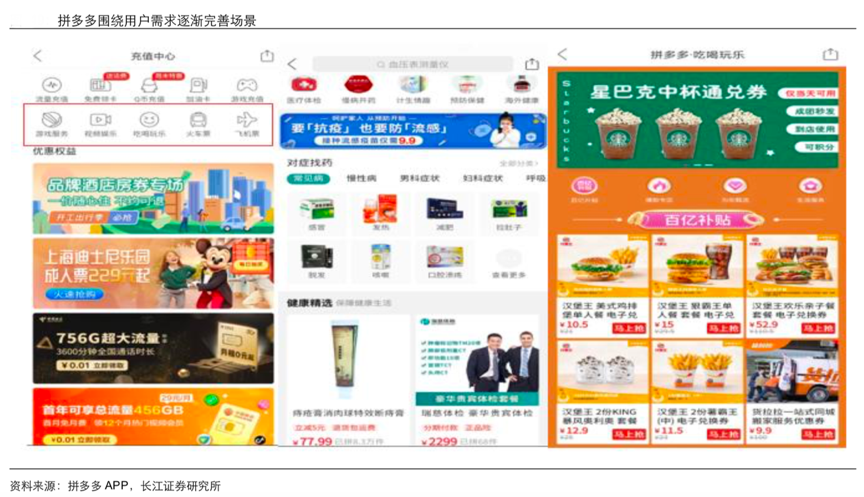 經(jīng)典案例:根據(jù)拼多多APP、長江證券研究所等綜合資訊表明,拼多多逐步完善圍繞消費(fèi)者生活的場景,包括嘗試打造出行端的飛機(jī)票、 火車票銷售,餐飲娛樂折價券以及醫(yī)藥體檢服務(wù)等等,向著成為消費(fèi)者代理人的角度進(jìn)一步深度布局,以形成更高的用戶粘性。
