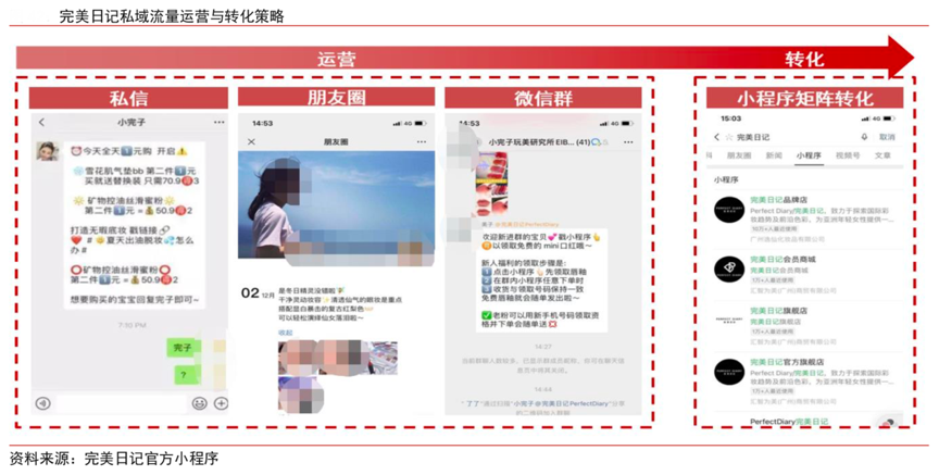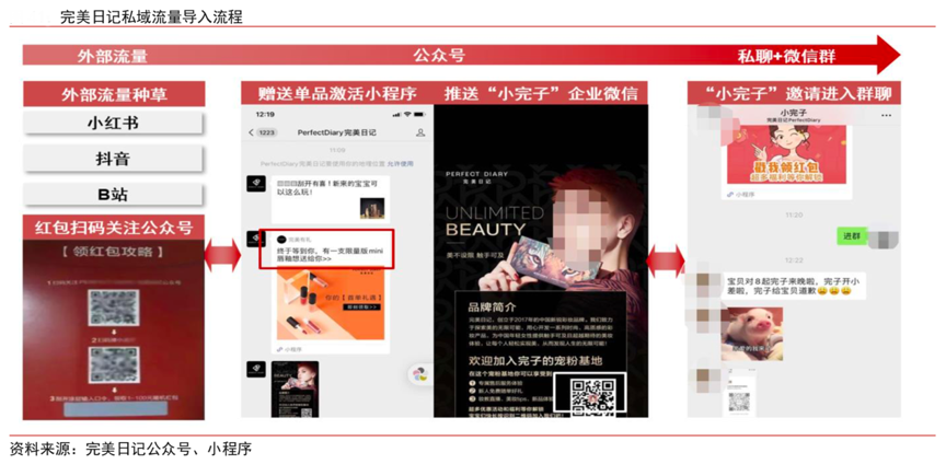 經(jīng)典案例:根據(jù)完美日記公眾號、小程序、中信證券研究部等綜合資訊表明,完美日記在小紅書 MAU 增長放緩后開始加大抖音、B 站等平臺的投放,持續(xù)種草擴大影響力,同時通過私域流量運營進一步培育品牌粘性與忠誠度。完美日記的產(chǎn)品包裹附送“紅包卡”, 引導(dǎo)用戶關(guān)注公眾號并添加“小完子”企業(yè)微信。用戶通過“小完子”邀請加入用戶群,完成私域流量沉淀。