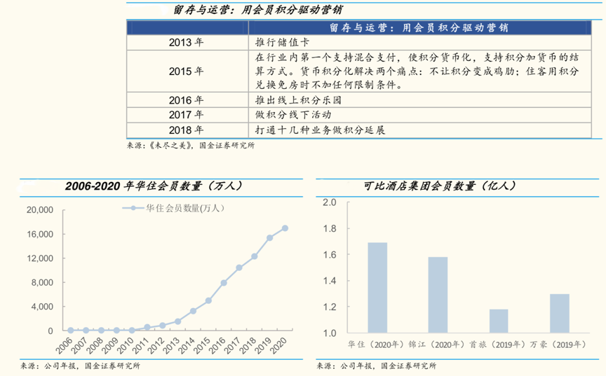 經(jīng)典案例:根據(jù)《未盡之美》、公司年報、國金證券研究所等綜合資訊表明,華住公司通過積分驅動營銷,線上積分線下活動等,加強與會員的互動,增加會員留存。其于2015年在行業(yè)內第一個支持混合支付,支持積分加貨幣的結算方式,同時在住客使用積分兌換免費房時不加任何限制,解決一直以來會員積分實際兌換價值低,對會員而言體驗感差的痛點。截至 2020 年年報,華住已擁有1.69億會員。