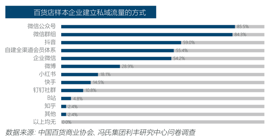 經(jīng)典案例:根據(jù)中國百貨商業(yè)協(xié)會(huì)、馮氏集團(tuán)利豐研究中心問卷調(diào)查等綜合資訊表明,零售商將一群對(duì)自己公司品牌認(rèn)可的消費(fèi)者通過自媒體、社交群組等聚集起來,可以在任意時(shí)間、免費(fèi)直達(dá)客戶群,與他們保持及時(shí)溝通,并通過各種活動(dòng)及內(nèi)容維持用戶黏性,實(shí)現(xiàn)營銷轉(zhuǎn)化。新冠疫情加快了實(shí)體百貨商 場數(shù)字化轉(zhuǎn)型,百貨零售企業(yè)積極通過各大社交媒體建立自己的私域流量,進(jìn)行更精準(zhǔn)的營銷,推動(dòng)加快 “貨找人”的過程。根據(jù)調(diào)查,微信公眾號(hào)及微信群組被認(rèn)為是最適合做私域流量的陣地。