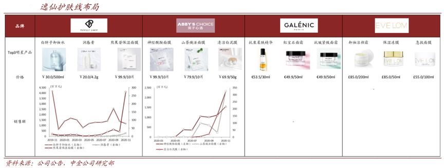 經(jīng)典案例:根據(jù)公司公告、中金公司研究部等綜合資訊表明,逸仙電商彩妝為基拓展衍生品類,滿足多元消費(fèi)需求。一方面,逸仙電商旗下主品牌“完美日記”以彩妝為基礎(chǔ),正逐步拓展安瓶、面膜等護(hù)膚類目;另一方面,通過子品牌“完子心選”的推出,進(jìn)一步完善在護(hù)膚領(lǐng)域的布局。2020 年 10 月逸仙電商收購(gòu)法國(guó) Pierre Fabre 集團(tuán)旗下高端藥妝護(hù)膚品牌 Galénic,2021 年 3 月宣布收購(gòu) Manzanita 旗下高端護(hù)膚品牌 Eve Lom,彰顯公司進(jìn)軍高端護(hù)膚的決心。