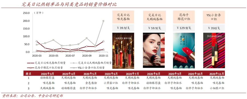 經(jīng)典案例:根據(jù)公司公告、中金公司研究部等綜合資訊表明,逸仙電商公司基于數(shù)據(jù)的產(chǎn)品開發(fā)實(shí)現(xiàn)對(duì)用戶需求的精準(zhǔn)定位,提升爆款打造的確定性和可復(fù)制性。2019年,其有 20 件單品銷量超過 100 萬,多件產(chǎn)品年銷量在百萬至千萬件量級(jí),印證其爆款打造實(shí)力。與天貓上質(zhì)量相當(dāng)?shù)钠渌放仆悊纹?nbsp;109-630 元的價(jià)格區(qū)間相比,逸仙電商公司單品的價(jià)格區(qū)間僅為 49-129 元。