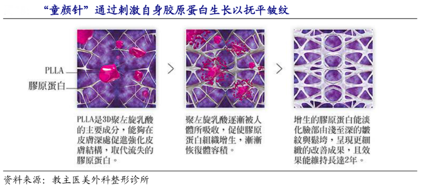 經(jīng)典案例:根據(jù)教主醫(yī)美外科整形診所、開(kāi)源證券研究所等綜合資訊表明,與物理填充的玻尿酸以及通過(guò)阻斷神經(jīng)對(duì)肌肉傳導(dǎo)達(dá)到除皺效果的肉毒素相比,童顏針通過(guò)促進(jìn)膠原蛋白分泌從深層改善皮膚狀態(tài), 其維持效果會(huì)更長(zhǎng)久。“童顏針”代表產(chǎn)品除法國(guó) Sculptra 舒顏萃外,還有美國(guó) DermaVeil 德美顏、韓國(guó) Aesthefill 愛(ài)塑美,目前國(guó)內(nèi)尚未有取得III類醫(yī)療器械產(chǎn)品注冊(cè)證的童顏針產(chǎn)品。