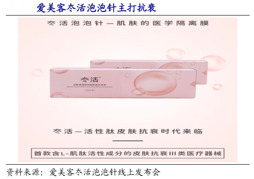 經(jīng)典案例:根據(jù)愛(ài)美客冭泡泡針線上發(fā)布會(huì)、開(kāi)源證券研究所等綜合資訊表明,愛(ài)美客在 2021 年 5 月推出冭活泡泡針?biāo)忸惍a(chǎn)品,主打抗衰,產(chǎn)品核心成分為 L-肌肽,具有抗氧化、抗糖化、賦活細(xì)胞三大功能,與超皮秒等其他光電類醫(yī)美項(xiàng)目配合,也具有較好治療效果。