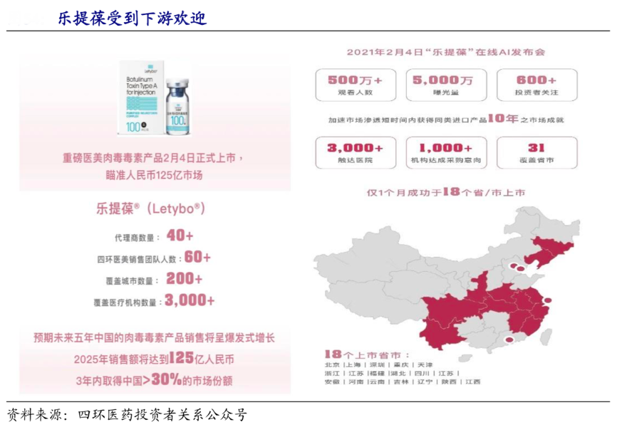 經(jīng)典案例:根據(jù)四環(huán)醫(yī)藥投資者關(guān)系公眾號、開源證券研究所等綜合資訊表明,2014 年四環(huán)醫(yī)藥與 Hugel 公司簽訂合作協(xié)議,旗下肉毒素產(chǎn)品樂提葆 2020 年 10 月在我國獲批,四環(huán)醫(yī)藥在中國具有獨(dú)家經(jīng)銷權(quán)。從產(chǎn)品方面看,樂提葆(俗稱“白毒”)是韓國市占率排名第一的肉毒素產(chǎn)品,產(chǎn)品彌散度小且價格略低于保妥適,與目前市場上其他三款產(chǎn)品可以實(shí)現(xiàn)錯位競爭,有望搶占肉毒素藍(lán)海市場。