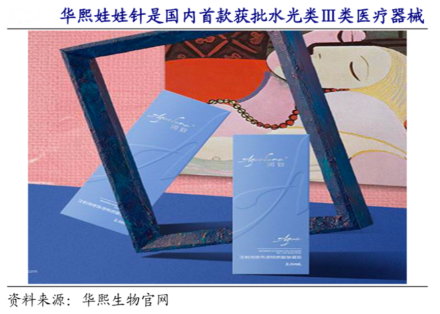 經(jīng)典案例:根據(jù)華熙生物官網(wǎng)、開源證券研究所等綜合資訊表明,華熙生物在 2020 年中推出了 Aqua 娃娃針,定位高端,技術(shù)上采用 HEC 高效交聯(lián)技術(shù),可以有效幫助肌膚實(shí)現(xiàn)緊致;成分上添加利多卡因,可以實(shí)現(xiàn)陣痛抗炎的作用,添加了 18 種氨基酸促進(jìn)膠原蛋白再生,提高肌膚彈性;功效上看,主打補(bǔ)水+緊致+平紋三效合一。