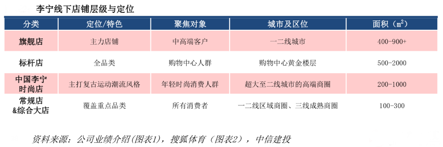 經(jīng)典案例:根據(jù)公司業(yè)績介紹、搜狐體育、中信建投等綜合資訊表明,李寧公司對(duì)大店層級(jí)類型進(jìn)行合理細(xì)分,門店的差異化定位增強(qiáng)了市場覆蓋質(zhì)量。旗 艦店作為主力店鋪,主要分布于一二線城市,以中高端客戶為主要目標(biāo);標(biāo)桿店定位為全品類,涵蓋李寧所有產(chǎn)品線,聚焦于購物中心人群;中國李寧時(shí)尚店主打復(fù)古運(yùn)動(dòng)潮流風(fēng)格,分布于超大至二線城市的高端商圈,主要覆蓋年輕時(shí)尚消費(fèi)人群;常規(guī)店和綜合大店廣泛分布在全國主要城市的所有渠道。