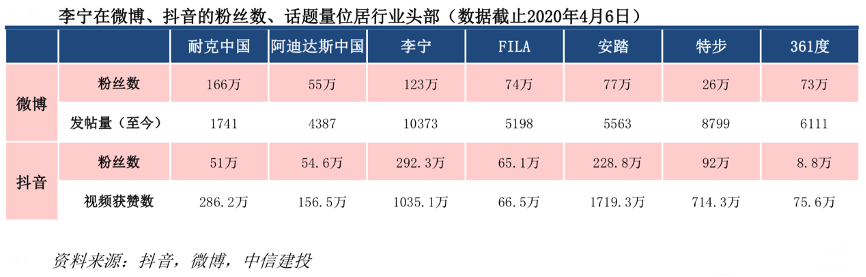 經(jīng)典案例:根據(jù)抖音、微博、中信建投等綜合資訊表明,在平臺(tái)覆蓋廣度方面,李寧公司自2019年起,全面發(fā)力新零售領(lǐng)域,利用LBS、微店、抖音、微信小程序等平臺(tái)和工具,實(shí)現(xiàn)無邊界的全場景服務(wù)和銷售,實(shí)現(xiàn)各個(gè)流量平臺(tái)的全面覆蓋,如公司在微 博粉絲數(shù)123萬(僅次于耐克中國),抖音粉絲數(shù) 292萬、位居運(yùn)動(dòng)品牌第一。在流量運(yùn)營方面,其聘用青春流量明星 (如華晨宇、肖戰(zhàn)等),打造現(xiàn)象級(jí)消費(fèi)事件,全年直播時(shí)長、觀看人數(shù)、用戶互動(dòng)等數(shù)據(jù)都處于行業(yè)領(lǐng)先水平。