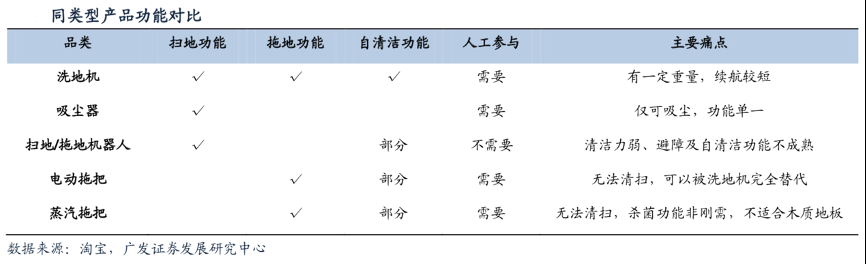 經(jīng)典案例:根據(jù)淘寶、廣發(fā)證券發(fā)展研究中心等綜合資訊表明,橫向?qū)Ρ韧愋彤a(chǎn)品,洗地機(jī)特色突出。目前地面清潔類電器有掃地機(jī)、吸塵器、電動(dòng)拖把、蒸汽拖把等,但均有其無法解決的痛點(diǎn)。同類型產(chǎn)品功能對(duì)比,目前來看洗地機(jī)的使用體驗(yàn)更好。