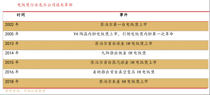 經(jīng)典案例:根據(jù)華西證券等綜合資訊表明,蘇泊爾以明火炊具起家,在廚房用品和明火炊具知名度常年位居行業(yè)第一,目前電飯煲市場(chǎng)份額僅次于美的,截至 2018 年 9 月達(dá)到 30.5%。其推出了國(guó)內(nèi)首臺(tái)球釜 IH 電飯煲、首臺(tái)蒸汽球釜 IH 電飯煲,美的推出國(guó)內(nèi)首臺(tái)真空變壓 IH 電飯煲、首臺(tái)非溫控電壓力鍋等,龍頭在傳統(tǒng)品類上能夠持續(xù)深耕,從技術(shù)到功能設(shè)計(jì)等進(jìn)行產(chǎn)品創(chuàng)新升級(jí),在原有品類的市場(chǎng)基礎(chǔ)上拓寬受眾、提升檔次,進(jìn)一步鞏固龍頭份額。
