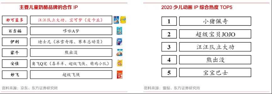 經(jīng)典案例:根據(jù)京東、雷報、東方證券研究所等綜合資訊表明,妙可藍多兒童奶酪產(chǎn)品自 2018 年起與知名少兒動畫 IP“汪汪隊”深度合作,通過產(chǎn)品包 裝吸引目標人群,百吉福、伊利等品牌則分別攜手哆啦 A 夢、迪士尼等動畫 IP。雷報統(tǒng)計顯示,綜合優(yōu)酷、愛奇藝、騰訊、芒果 TV 四大平臺數(shù)據(jù)來看,2020 年《汪汪隊立大功》在少兒動畫 IP 熱度中排名第三,在眾多奶酪品牌聯(lián)合動畫 IP 中脫穎而出。此外,2020年其與寶可夢合作推出金裝奶酪棒,定位目標人群父母進行“家庭化”營銷。