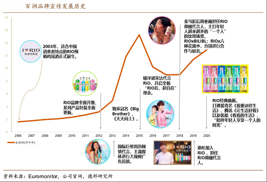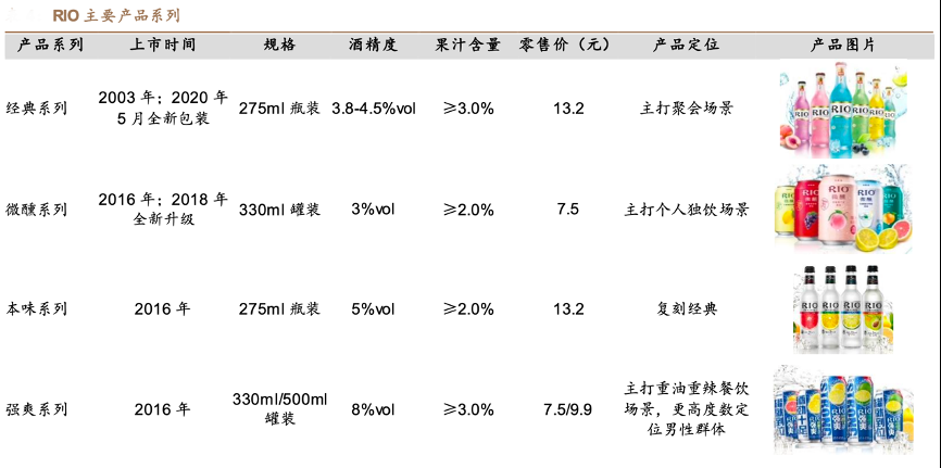 經(jīng)典案例:根據(jù)Euromonitor、公司官網(wǎng)、德邦研究所等綜合資訊表明,順應(yīng)行業(yè)發(fā)展, RIO 經(jīng) 典瓶于 2003 年上市,2010 年前市場(chǎng)處于早期培育階段,行業(yè)起步期主要消費(fèi)場(chǎng) 景為夜場(chǎng),2010 年后公司將品牌進(jìn)一步定位為“小姐妹聚會(huì)的青春小酒”,產(chǎn)品定位追逐時(shí)尚的年輕女性,消費(fèi)場(chǎng)景也從夜場(chǎng)向餐飲延伸。2018年微醺大單品全面升級(jí)后,其在宣傳上定位更為精準(zhǔn),簽約當(dāng)紅明星鄧倫、周冬雨作為代言人,定位為“一個(gè)人的小酒”,將消費(fèi)場(chǎng)景拓展到居家休閑場(chǎng)景,塑造了“有溫度”的品牌形象。