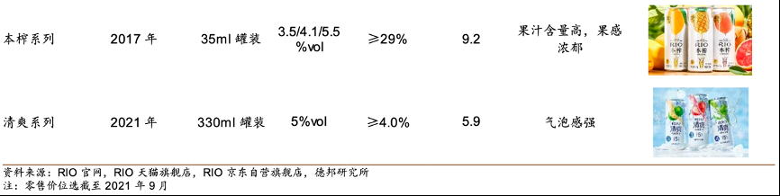 經(jīng)典案例:根據(jù)RIO官網(wǎng)、RIO天貓旗艦店、RIO京東自營(yíng)旗艦店、德邦研究所等綜合資訊表明,當(dāng)前RIO公司預(yù)調(diào)酒已包括不同酒精度的微醺系列、經(jīng)典系列、清爽系列、強(qiáng)爽系列、夜獅系列、限定/聯(lián)名/定制系列等多個(gè)系列50多種口味,而當(dāng)前新銳品牌口味大多為個(gè)位數(shù),其在產(chǎn)品端已形成先發(fā)優(yōu)勢(shì)。