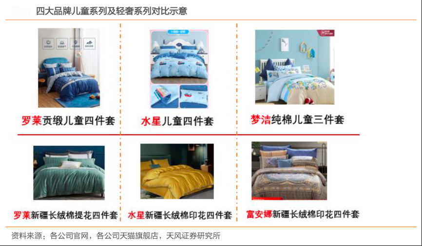 經(jīng)典案例:根據(jù)各公司官網(wǎng)、各公司天貓旗艦店、天風(fēng)證券研究所等綜合資訊表明,從四大品牌天貓旗艦店中獨(dú)立分類的兒童及輕奢等特定功能、特定價(jià)位產(chǎn)品系列設(shè)計(jì)對(duì)比來(lái)看,同類型產(chǎn)品立足相同的設(shè)計(jì)風(fēng)格基礎(chǔ)(兒童系列活潑配色+卡通主題圖案)或者材質(zhì)功能基礎(chǔ)(輕奢系列長(zhǎng)絨棉+提花/印花處理),產(chǎn)品區(qū)分度主要來(lái)自細(xì)節(jié)設(shè)計(jì)及加工工藝、功能設(shè)計(jì)的處理。