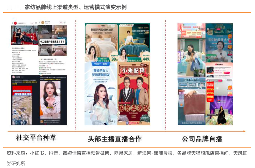 經(jīng)典案例:根據(jù)小紅書(shū)、抖音、薇婭佳琦直播預(yù)告微博、網(wǎng)易家居、新浪網(wǎng)-瀟湘晨報(bào)、各品牌天貓旗艦店直播間、天風(fēng)證券研究所等綜合資訊表明,2019~2020 期間,新興社交平臺(tái)流量規(guī)模高速積累,家紡品牌相繼尋求與主播帶貨合作,擁抱頭部主播流量紅利,實(shí)現(xiàn)從社交電商向新興直播電商轉(zhuǎn)型邁進(jìn);同時(shí)頭部主播較高的合作費(fèi)用,以及較為終端折扣較深等客觀因素,催化各家紡品牌組建品牌自有直播團(tuán)隊(duì),實(shí)現(xiàn)對(duì)流量紅利、終端盈利水平多方因素平衡。