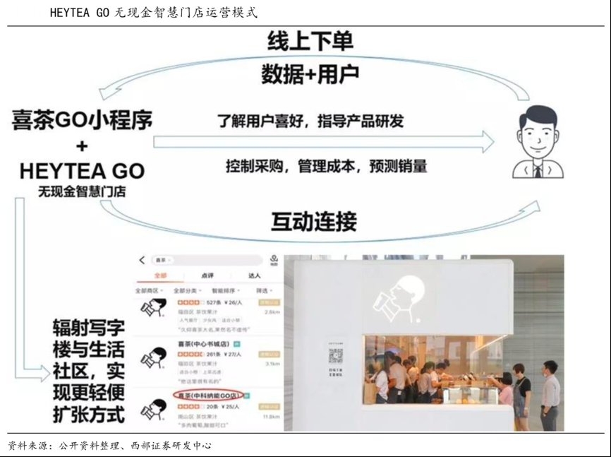 經典案例:根據公開資料、西部證券研發(fā)中心等綜合資訊表明,喜茶公司推出“喜茶GO”小程序+HEYTEA GO無現金智慧門店,將服務與產品在線化,同時有效輻射寫字樓與生活社區(qū),實現更輕便擴張方式。HEYTEA GO無現金智慧門店是區(qū)別于星巴克、樂樂茶等其他茶飲的主要特色。