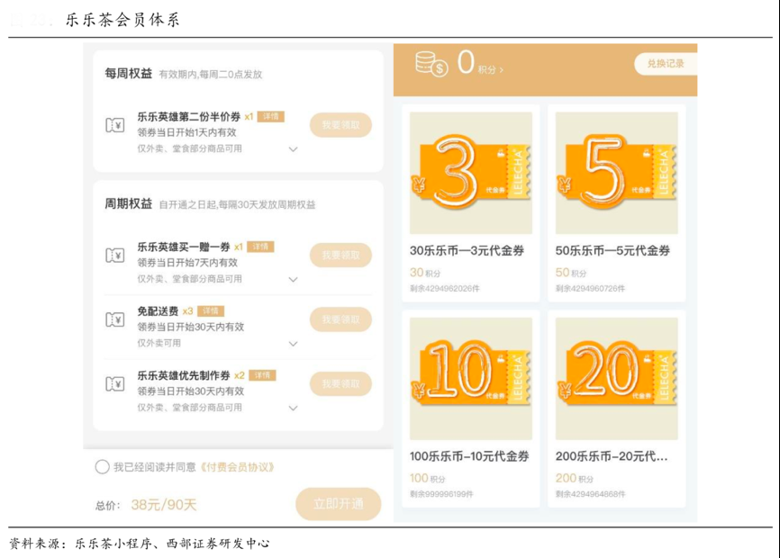 經典案例:根據樂樂茶小程序、西部證券研發(fā)中心等綜合資訊表明,樂樂茶會員體系如下,一次性購買,不分會員等級,38 元/90 天,首次購買享樂樂英雄買一送一券 X1(開通 7 天內),樂樂英雄優(yōu)先制作券 X2(開通 30 天內),免費配送 X3(開 通 30 天內);享受配送費 7 折,雙倍積分,雙倍經驗;積分和經驗可用于抵優(yōu)惠券。