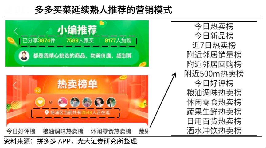 經(jīng)典案例:根據(jù)拼多多APP、光大證券研究所等綜合資訊表明,多多買菜延續(xù)熟人推薦的營銷模式,設(shè)有小編推薦、熱賣榜單等板塊,其中熱賣榜單除了按產(chǎn)品分類外,還設(shè)有附近鄰居銷量榜、附近鄰居回購榜、附近 500m 熱賣榜等欄目。用戶參考鄰居購買記錄將降低某一社區(qū)周邊 SKU 數(shù),提高單 SKU 銷量,從而在一定程度上降低履約成本。