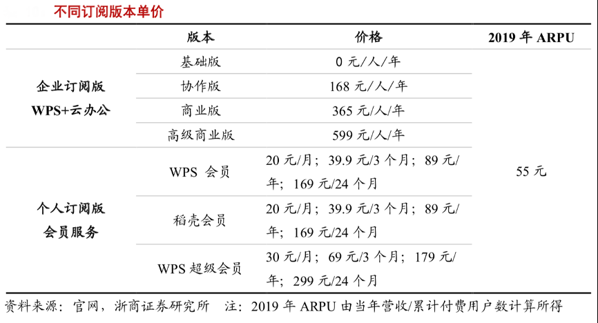 經(jīng)典案例:根據(jù)官網(wǎng)、浙商證券研究所等綜合資訊表明,由于銷售過(guò)程伴隨著優(yōu)惠、渠道分傭,根據(jù)當(dāng)年?duì)I收/累計(jì)付費(fèi)用戶數(shù)計(jì)算所得,目前金山辦公訂閱用戶會(huì)員客單價(jià)約為 55 元。隨著公客戶粘性的持續(xù)提升、話語(yǔ)權(quán)提高,以及新增功能模塊,中小企業(yè)市場(chǎng)云辦公的大力拓展,中長(zhǎng)期機(jī)構(gòu)、個(gè)人訂閱客單價(jià)有望提升至 250 元/年和 130 元/年。