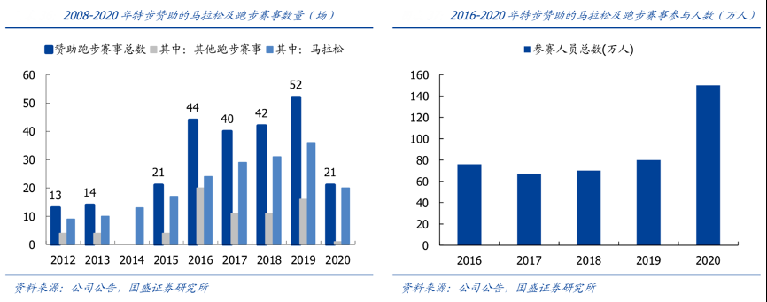 經(jīng)典案例:根據(jù)公司公告、國盛證券研究所等綜合資訊表明,2016-2019 年,特步蟬聯(lián)中國內(nèi)地贊助最多馬拉松賽事的體育品牌,2020年疫情期間其創(chuàng)造性的舉辦線上跑步賽事,全年舉辦 21 場跑步賽事,其中包括 9 場線上賽事,合計吸引 150 萬+參賽人員。目前特步主品牌同多名國家級運動員有合作關(guān)系,包括現(xiàn)役馬拉松成績最佳的運動員董國建、現(xiàn)役馬拉松成績第二運動員彭建華等。