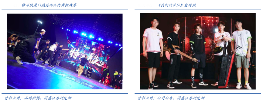 經典案例:根據品牌微博、公司公告、國盛證券研究所等綜合資訊表明,特步2018年“特不服”企劃啟動,將彰顯品牌潮流態(tài)度、傳播街頭文化、貼近年輕消費者作為所有營銷活動的出發(fā)點和立足點。在該企劃下,特步的第一個大動作就是贊助現象 級網綜《中國新說唱》,將說唱內含的反叛、獨立、自由精神和特步的潮流態(tài)度深度結合。2020 年,為了更好的推廣旗下“街頭”系列產品,特不服開啟 3.0 模 式,通過擔任音樂真人秀《我們的樂隊》官方指定鞋服贊助商極大的提升了品牌在年輕 消費群體中的熱度。