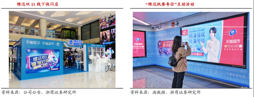 經(jīng)典案例:根據(jù)公司公告、淘數(shù)據(jù)、浙商證券研究所等綜合資訊表明,2018年雙十一期間,維達(dá)在線下開設(shè)“維達(dá)雙 11- 儷薦好物”快閃店,通過現(xiàn)場體驗(yàn)、電商直播進(jìn)行互相引流;2020年雙十一期間,維達(dá)品牌攜手孫儷、宋威龍雙代言開啟「#維達(dá)紙要夸你#」互動環(huán)節(jié),鼓勵粉絲打卡并引流至線上進(jìn)行轉(zhuǎn)化,截至 11 月 11 日 24 點(diǎn),微博話題「#維達(dá)紙要夸你#」的閱讀量突破 2300 萬。