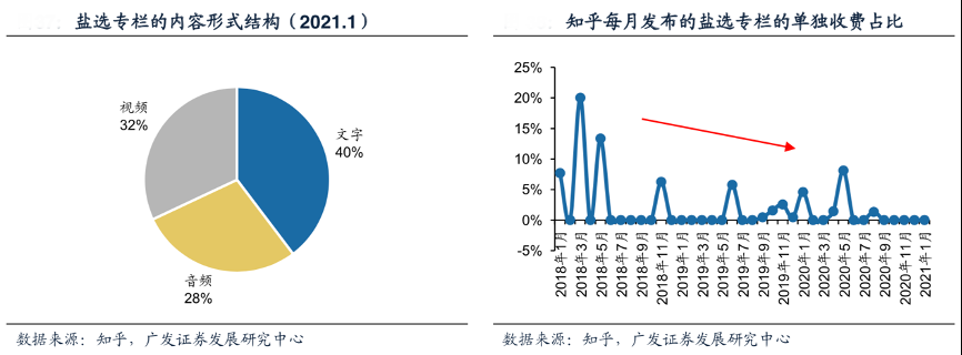經(jīng)典案例:根據(jù)知乎、廣發(fā)證券發(fā)展研究中心等綜合資訊表明,鹽選專欄是創(chuàng)作者提供的訂閱內(nèi)容。截止2021年1月,3635場(chǎng)鹽選專欄形式分別為文字內(nèi)容(占比39.7%)、音頻內(nèi)容(占比28.3%)、 視頻內(nèi)容(占比32.0%),其中知乎獨(dú)家或自制的內(nèi)容占比達(dá)到28.2%。內(nèi)容類別涵蓋科學(xué)、財(cái)商、故事、親子等等,故事專欄的熱度最高,熱度總榜TOP100中有87個(gè)故事專欄。目前94.8%的鹽選專欄對(duì)鹽選會(huì)員免費(fèi)開放,隨著時(shí)間推移,鹽選專欄逐漸向輕度化、泛娛樂內(nèi)容發(fā)展,專欄的單獨(dú)收費(fèi)比例也隨之降低。